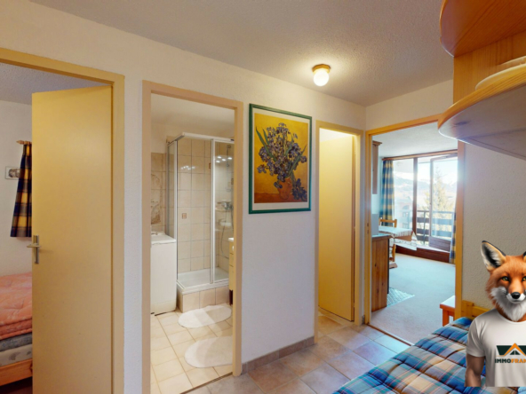 Entrée astucieuse avec un coin montagne équipé de deux couchages. Séjour lumineux de 15,81 m² avec cuisine ouverte et un accès direct à une terrasse, idéale pour profiter d’une pause bien méritée après une journée de ski.