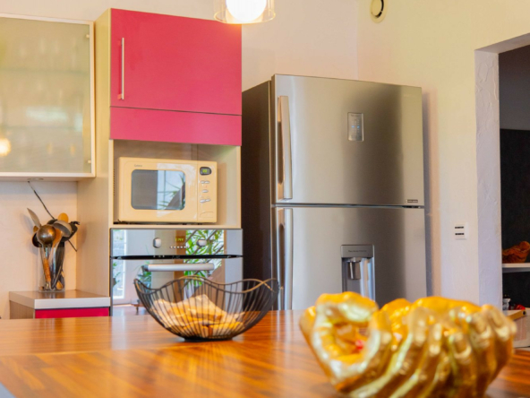 – Cuisine entièrement équipée avec gazinière à quatre feux, hotte et lave-vaisselle de marque Bosch, pour les passionnés de cuisine.