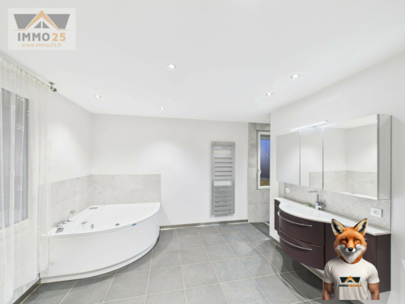 Elle se compose d’un sous-sol complet et d’un grand garage de 53m2 avec porte électrique, de 5 chambres, d’une salle de bain avec baignoire balnéo et douche à l’italienne, et d’un salon/séjour traversant.