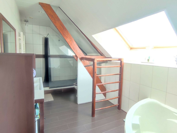 Etage: deux chambres, salle de bains + douche et wc. Pièce rangement.